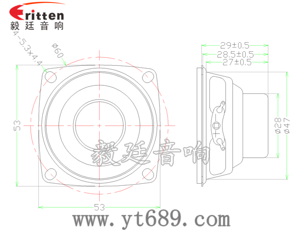 53mm方形鐵盆架內磁全頻喇叭,散熱性能好,耐沖擊,保持音色清晰、完美。