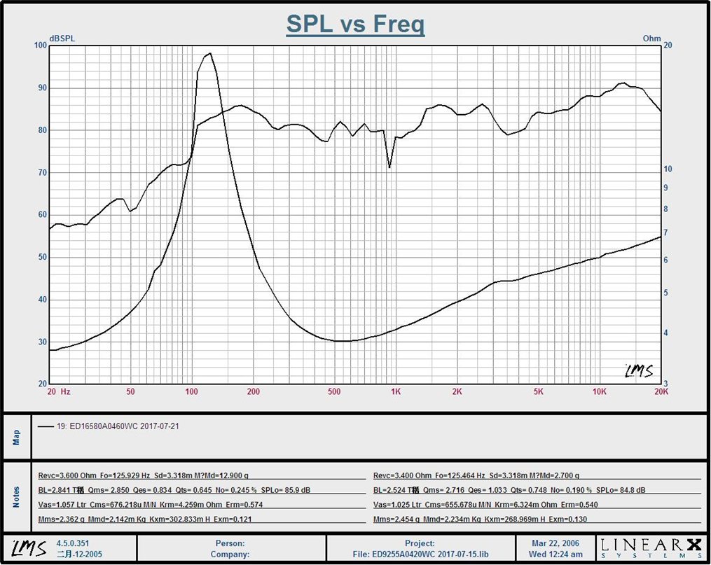 其低頻彈性非常好,下潛很深,中頻表現非常完美(平整走向),即使在大動態下也從容自如,在配合相等容積箱體時,低音非常的震撼,夠沉、夠力、速度快,中頻非常清晰悅耳。