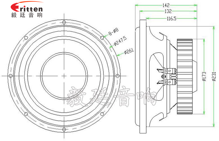 10寸圓形鐵盆架外磁重低音喇叭,采用了高性能鐵氧體,動力足,外帶磁鋼套,使喇叭外觀更加完美;