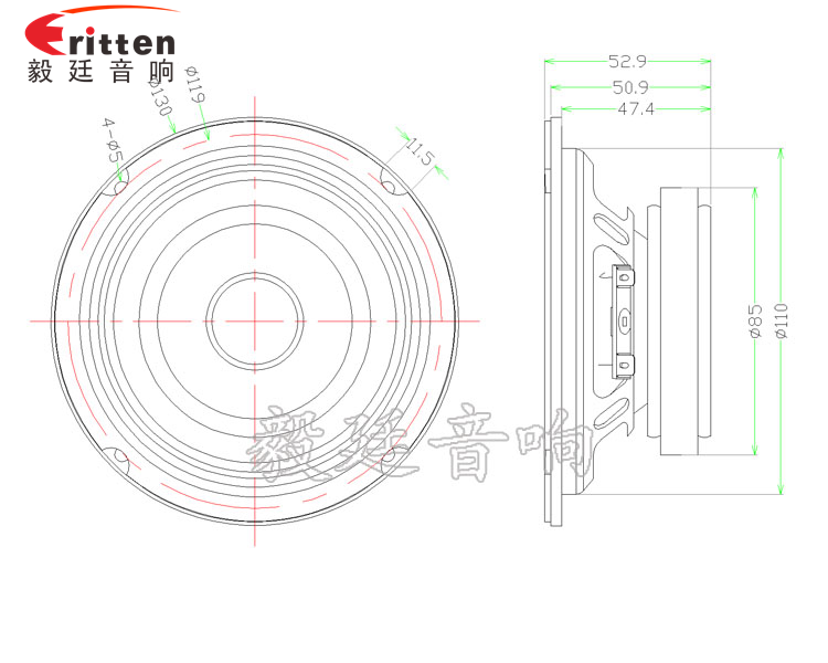 采用的是紅色防水全紙盆極25芯、鋁音圈,音色飽滿,低頻震撼;