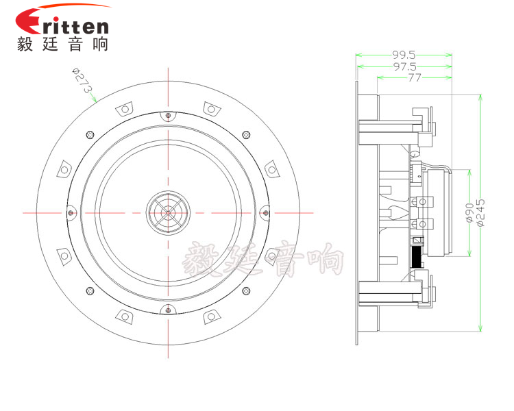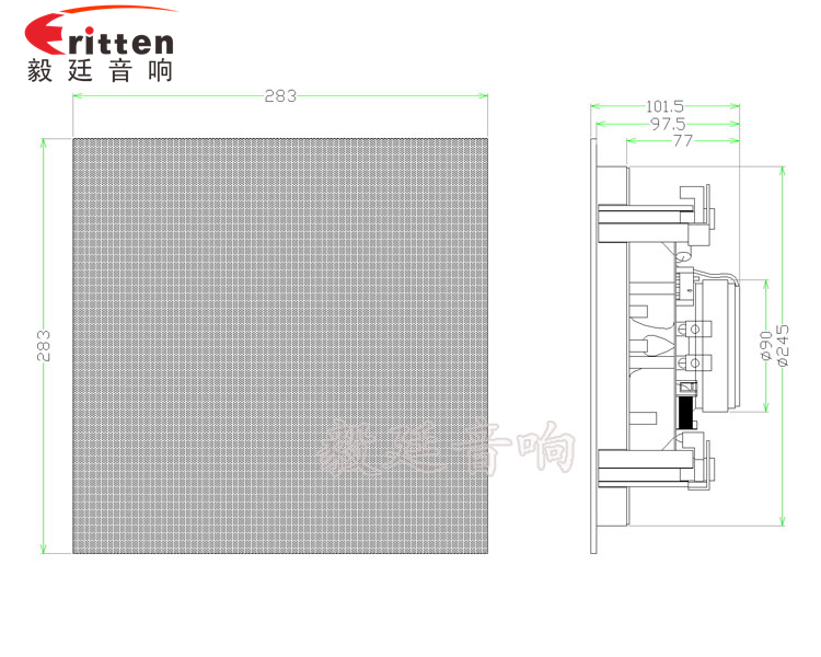 這款天花喇叭的外觀防塵罩,用的是高密度金屬網罩進過環保烤漆工藝,手感平滑,不褪色、不生銹、不氧化、超窄邊有圓形和正方形兩種防塵罩形狀,帶八個超強磁吸鐵,可吸性強,外觀大氣、精美,是毅廷喇叭工程師精心研發的一款超完美的8寸天花吸頂式喇叭。